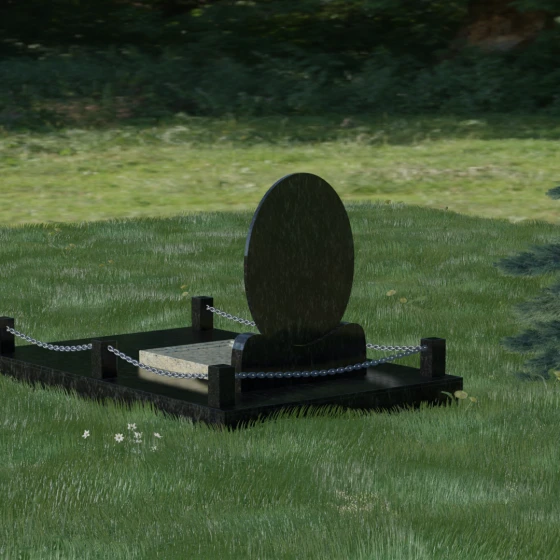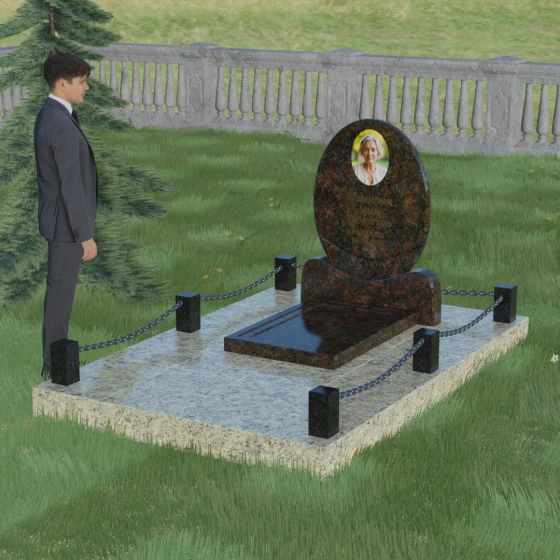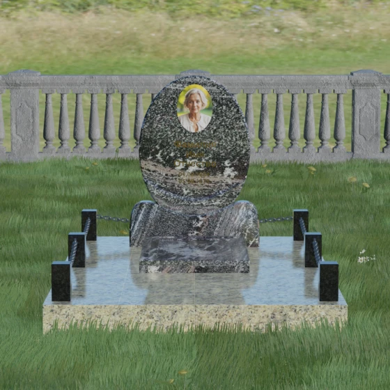 Центральным элементом стелы является глубокая ниша под овальный портрет (керамику или фото в стекле), которая идеально вписана в общую геометрию. Такое конструктивное решение защищает края портрета от сколов и придает образу завершенность. Ниже располагается пространство для эпитафии и дат, где каждая буква вырезается с идеальной четкостью. Благоустройство участка выполнено по высшему разряду: композиция дополняется массивной надгробной плитой, которая полностью закрывает цветник. Это не только придает объекту монументальный и законченный вид, но и значительно упрощает уход за местом памяти, избавляя от необходимости борьбы с сорняками. Периметр участка обрамляет строгий каменный цоколь, состоящий из полированных столбиков и соединительных элементов, которые могут быть дополнены декоративными цепями, создавая камерное и защищенное пространство.