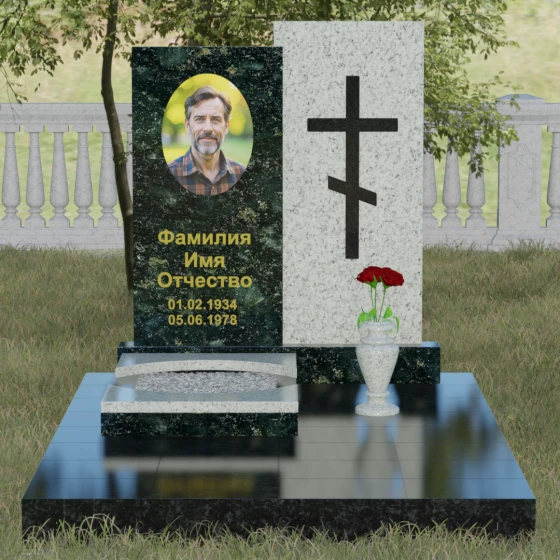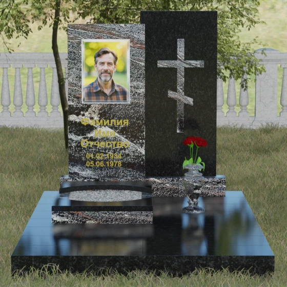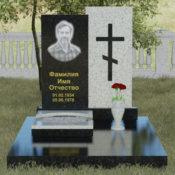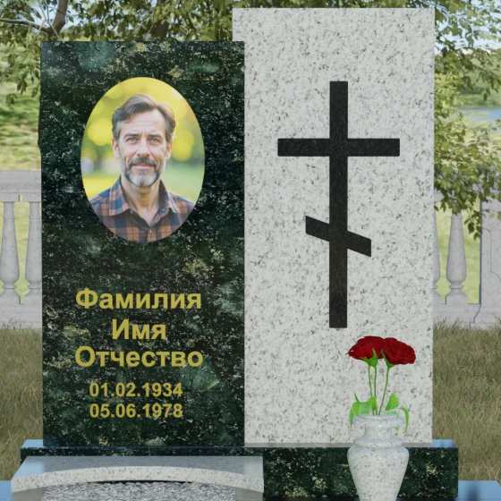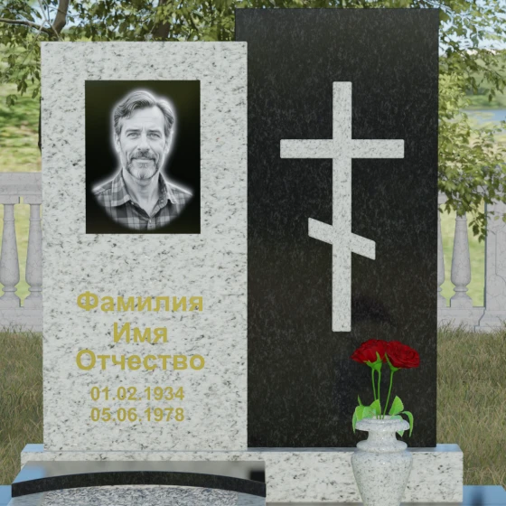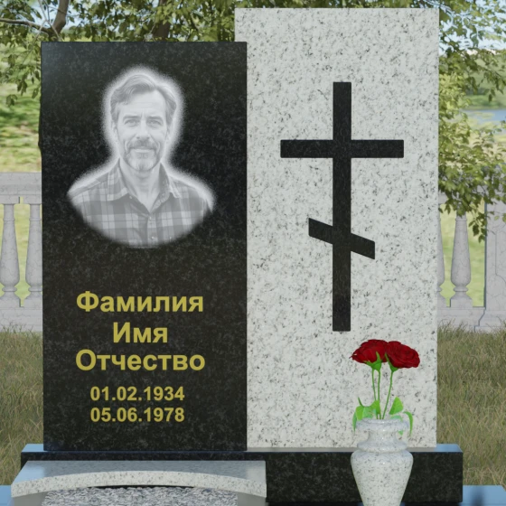 Данная модель представляет собой сложную двухкомпонентную конструкцию, построенную на гармонии противоположностей. Основной вертикальный элемент разделен на две части разного цвета и фактуры. Левая панель, выполненная из темного, глубокого камня, предназначена для центрального акцента — портрета и мемориальных надписей. Благодаря идеальной гладкости, гравировка здесь выглядит максимально четко, а портрет обретает фотографическую точность и одухотворенность. Правая часть композиции — это блок из светлого камня, на котором располагается лаконичный православный крест. Крест выполнен в строгом черном цвете, что создает мощный визуальный контраст на светлом фоне, подчеркивая духовную чистоту и значимость символа веры. Геометрия модели подчеркнуто строгая: прямые линии и четкие грани символизируют твердость характера и прямоту жизненного пути.