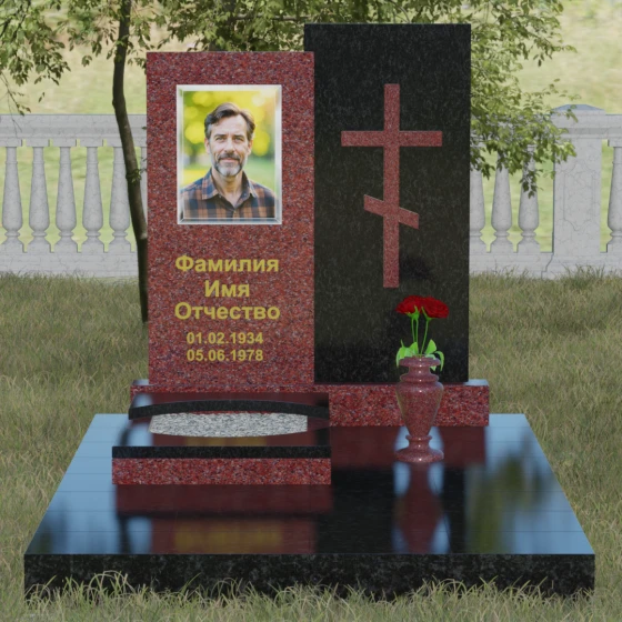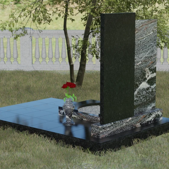 Благоустройство участка в данной модели выполнено по европейскому стандарту. Весь ансамбль установлен на массивный гранитный цоколь, который служит надежным фундаментом и защищает конструкцию от перекосов почвы. Вместо традиционного открытого цветника здесь используется закрытая надгробная плита оригинальной формы. Её верхний элемент выполнен в виде изящной светлой арки, которая эффектно возвышается над темным основанием, создавая многоуровневость. Такое решение не только придает мемориалу законченный, аккуратный вид, но и значительно упрощает уход за местом захоронения. Завершает композицию изящная каменная ваза, интегрированная в общую стилистику, что позволяет всегда поддерживать эстетику участка, украшая его цветами в знак вечной любви.