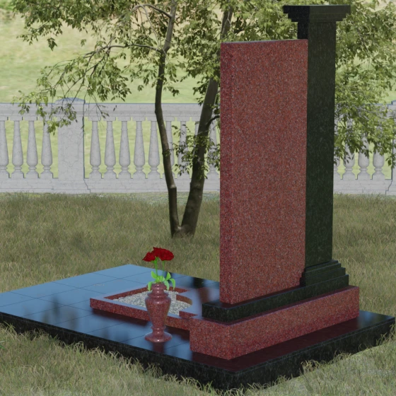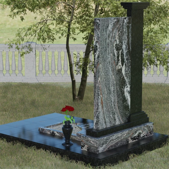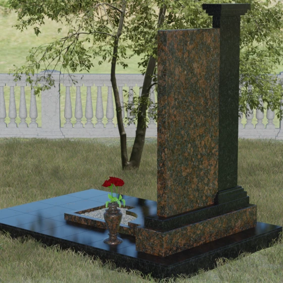 Композиция данного надгробия построена на гармоничном сочетании двух вертикальных элементов, установленных на массивное ступенчатое основание. Левая часть выполнена в виде величественной колонны с декоративным навершием в классическом стиле. На фронтальной стороне колонны расположена гравировка православного креста, покрытая сусальным золотом или имитирующим его составом, что придает мемориалу торжественный и одухотворенный вид. Правая часть — это лаконичная прямоугольная стела, предназначенная для размещения портрета и памятных надписей. Строгая геометрия линий подчеркивает внутреннюю силу и достоинство того, чья память здесь увековечена.