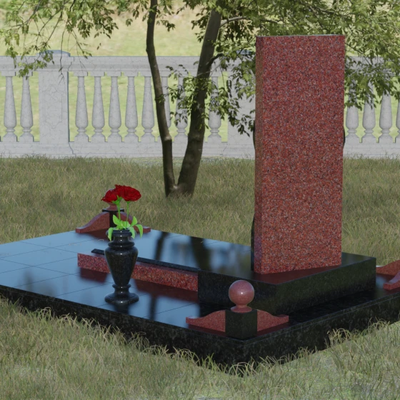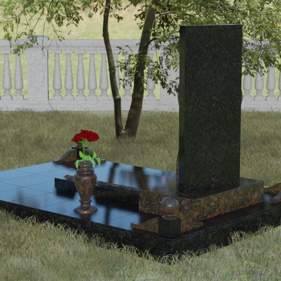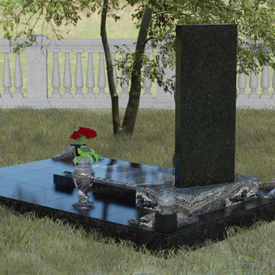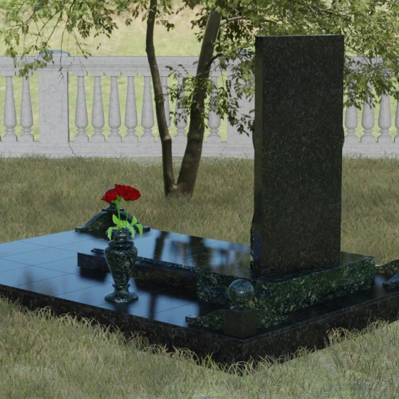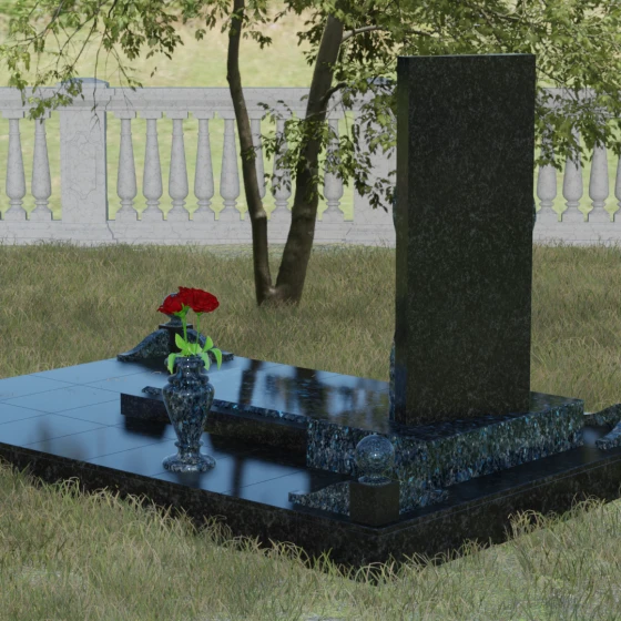 Особое внимание уделено благоустройству прилегающей территории. Стела установлена на массивный горизонтальный цоколь с глубокой зеркальной полировкой, которая визуально облегчает конструкцию, отражая небо и ландшафт. В состав комплекса входят декоративные элементы, завершающие облик: точеные каменные шары и изящная ваза, выполненные в едином стиле с основным изделием. Использование закрытой надгробной плиты или комбинированного цветника обеспечивает участку ухоженный и аккуратный вид на десятилетия, минимизируя необходимость сложного ухода за почвой.