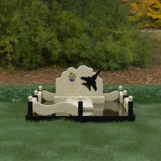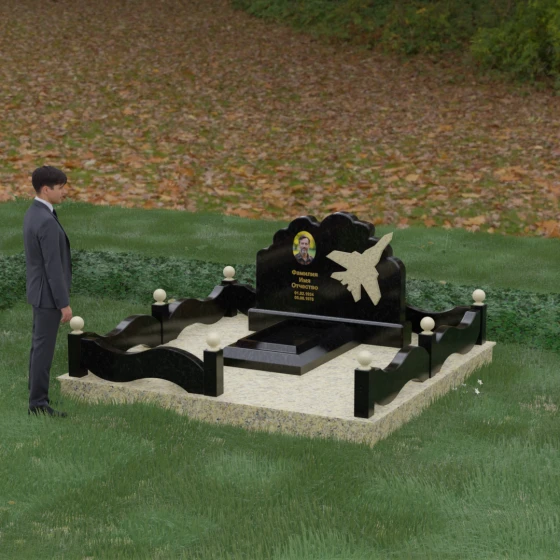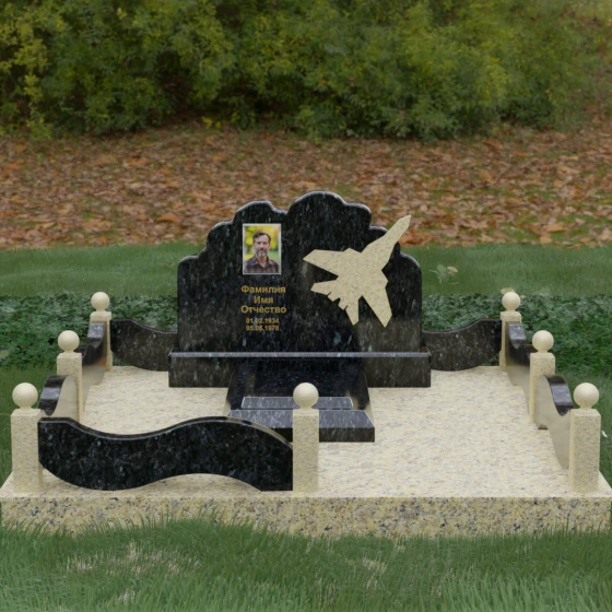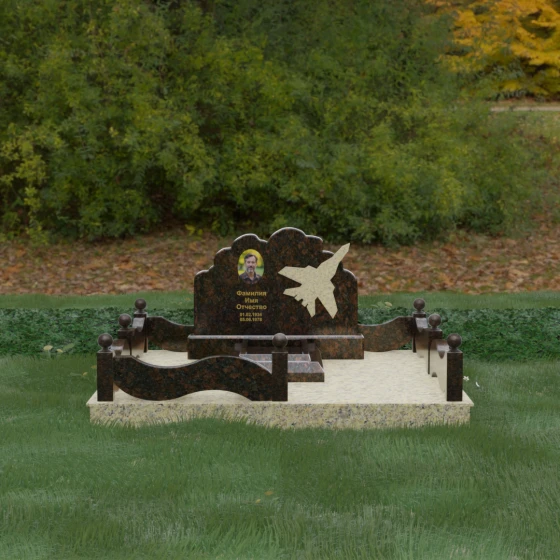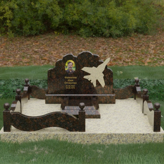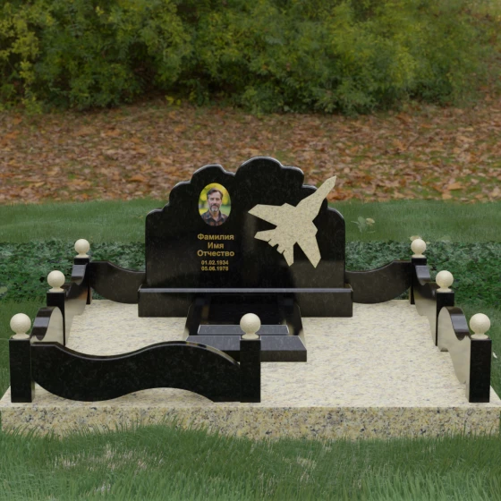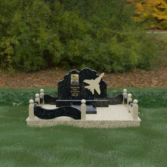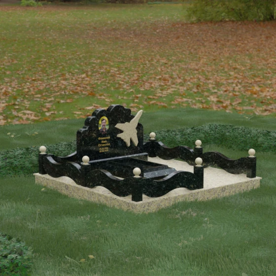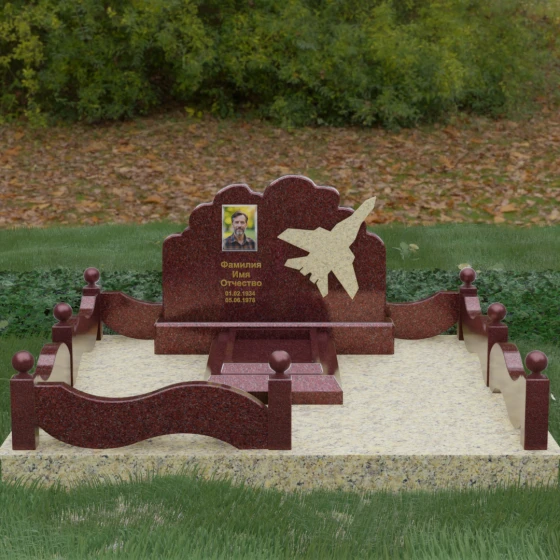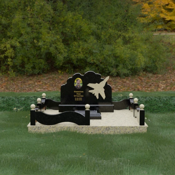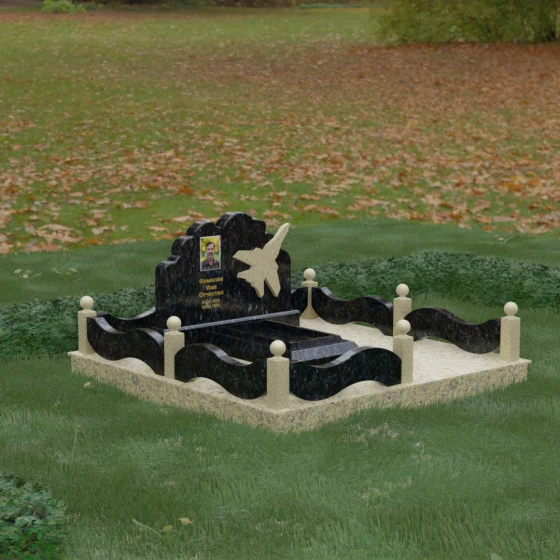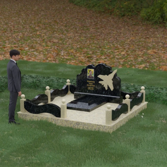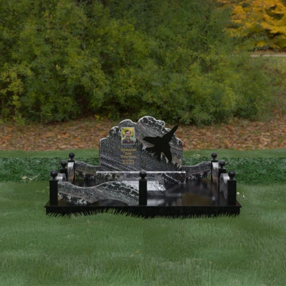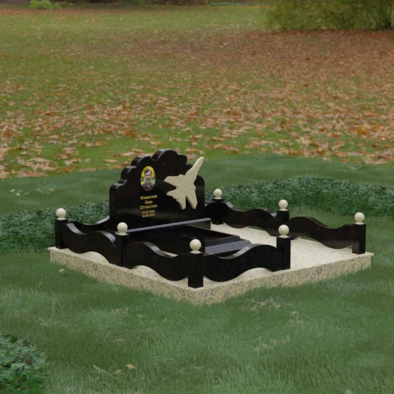 Данная мемориальная композиция представляет собой величественный ансамбль, в котором строгость камня смягчается плавностью природных линий. Выбор горизонтальной формы стелы продиктован стремлением создать ощущение покоя, стабильности и масштабности. Главным акцентом изваяния служит искусно выполненный силуэт истребителя, который словно устремляется ввысь на фоне резного навершия, напоминающего кучевые облака. Эта деталь превращает надгробие в персональный трибьют человеку, чья жизнь была неразрывно связана с небом, высотой и долгом перед Отечеством. Плавная волна верхнего края стелы гармонично перекликается с формой ограждения, создавая единое визуальное пространство, наполненное глубоким смыслом и уважением к памяти ушедшего.