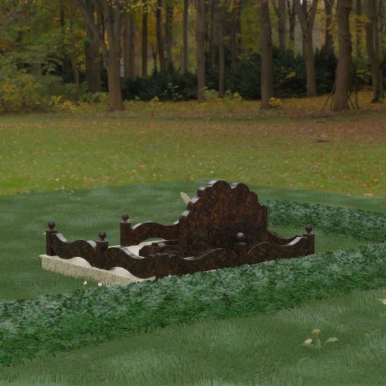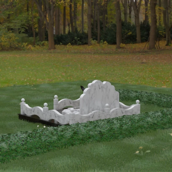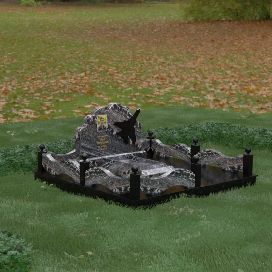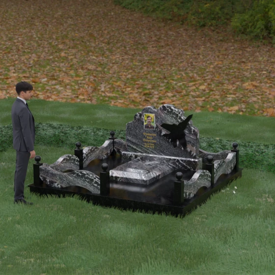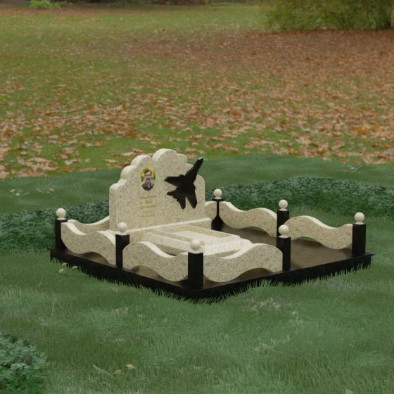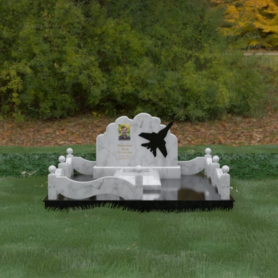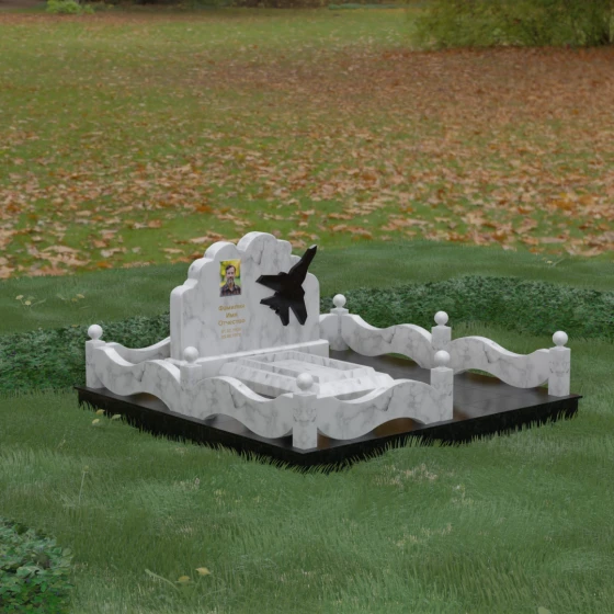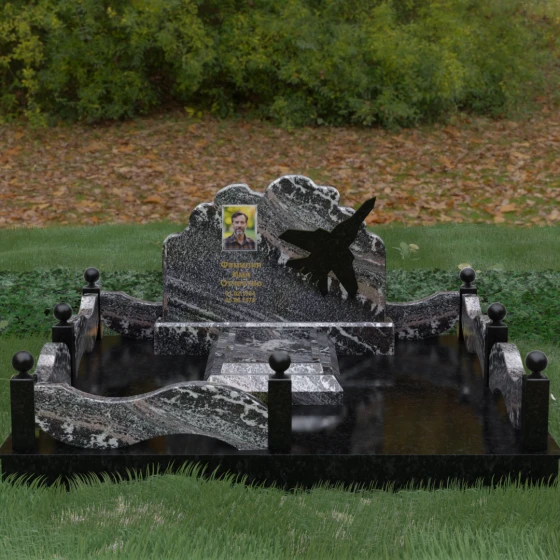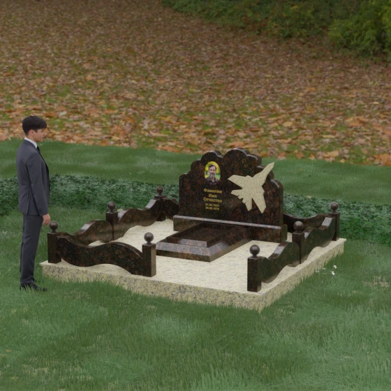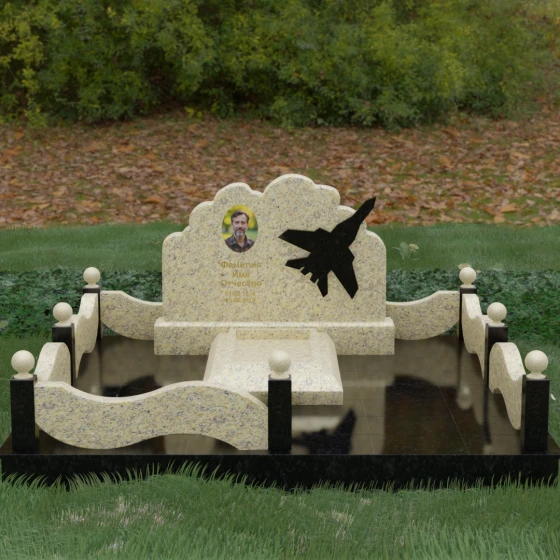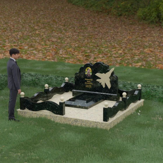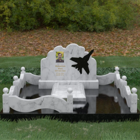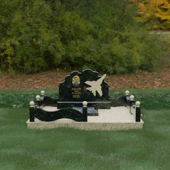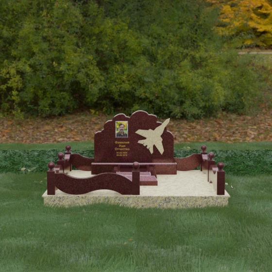 Данная мемориальная композиция представляет собой величественный ансамбль, в котором строгость камня смягчается плавностью природных линий. Выбор горизонтальной формы стелы продиктован стремлением создать ощущение покоя, стабильности и масштабности. Главным акцентом изваяния служит искусно выполненный силуэт истребителя, который словно устремляется ввысь на фоне резного навершия, напоминающего кучевые облака. Эта деталь превращает надгробие в персональный трибьют человеку, чья жизнь была неразрывно связана с небом, высотой и долгом перед Отечеством. Плавная волна верхнего края стелы гармонично перекликается с формой ограждения, создавая единое визуальное пространство, наполненное глубоким смыслом и уважением к памяти ушедшего.