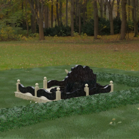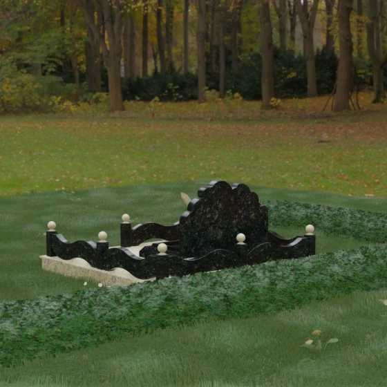 Особое внимание уделено благоустройству участка. Вместо традиционного открытого грунта здесь реализовано полное мощение массивными гранитными плитами. Такое решение не только придает захоронению завершенный и дорогой вид, но и значительно упрощает уход за местом памяти, сохраняя безупречную чистоту в любое время года. Окружающий монумент цоколь выполнен в виде изящных волнообразных панелей, соединенных столбиками с навершиями в форме идеальных каменных шаров. Эти сферы добавляют композиции торжественности и завершенности, подчеркивая элитный статус мемориала.