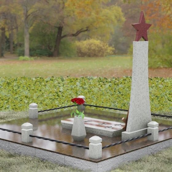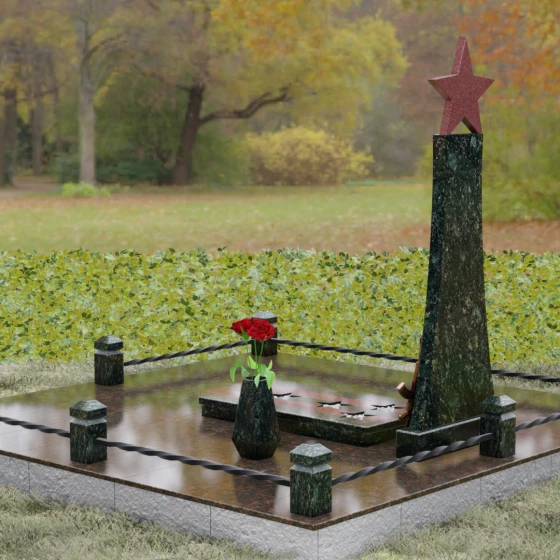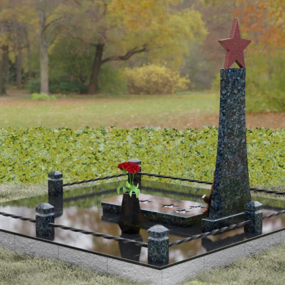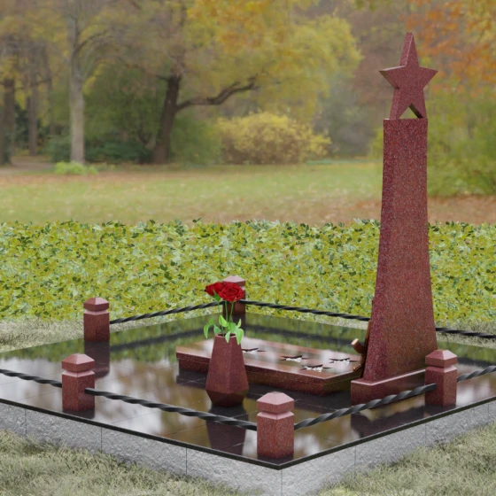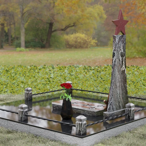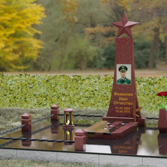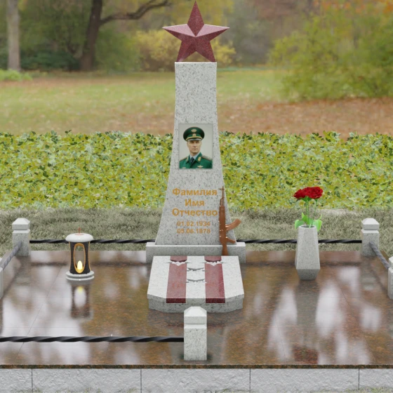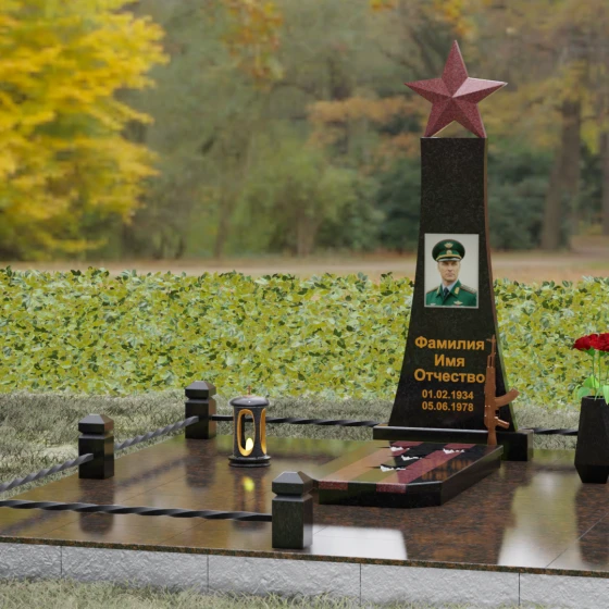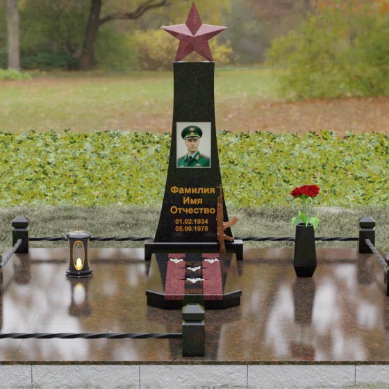 Мемориальный комплекс под артикулом 190 — это воплощение мужества, дисциплины и вечной памяти о человеке, чья жизнь была неразрывно связана с воинским долгом. Центральное место в композиции занимает высокая вертикальная стела, имеющая строгую, сужающуюся кверху геометрию. Такая форма выбрана неслучайно: она создает мощную визуальную вертикаль, направляющую взгляд зрителя ввысь, символизируя духовное восхождение и бессмертие подвига. Венчает монумент объемная пятиконечная звезда насыщенного красного цвета — символ чести и принадлежности к офицерскому корпусу. Одной из самых значимых и уникальных деталей данной модели является реалистично выполненная объемная фигура автомата Калашникова, прислоненного к боковой грани стелы. Этот элемент резьбы выполнен с безупречной точностью, подчеркивая профессиональный путь усопшего. Надгробие из натурального камня в таком исполнении выглядит величественно и бескомпромиссно, заявляя о силе характера того, кому оно посвящено.