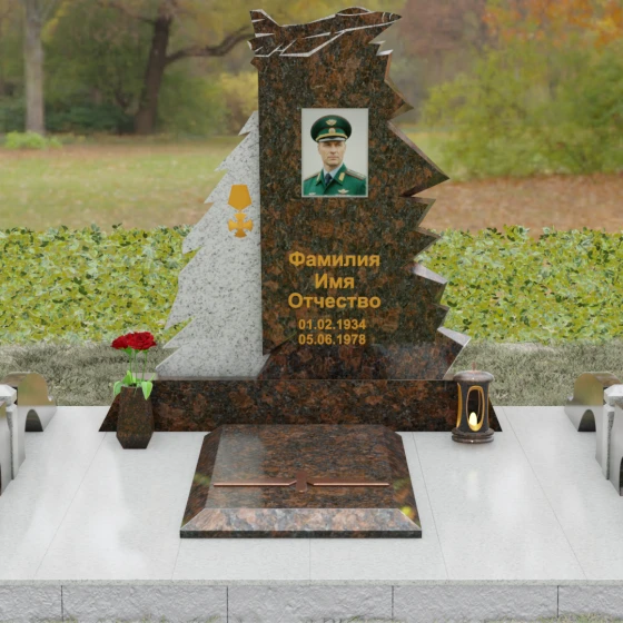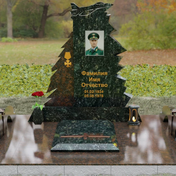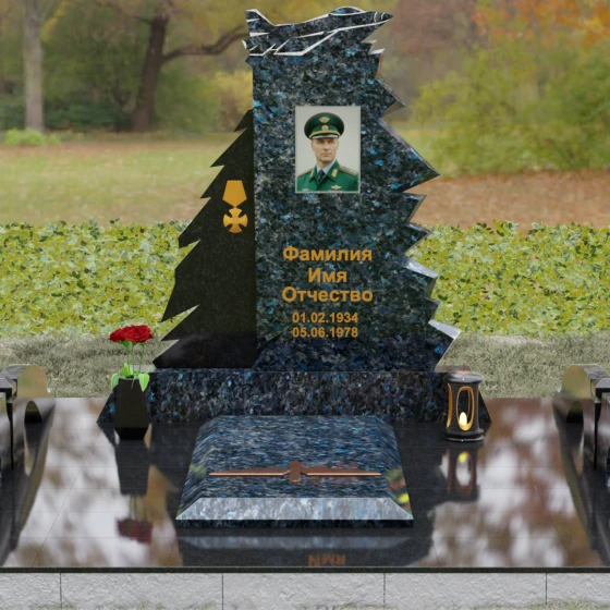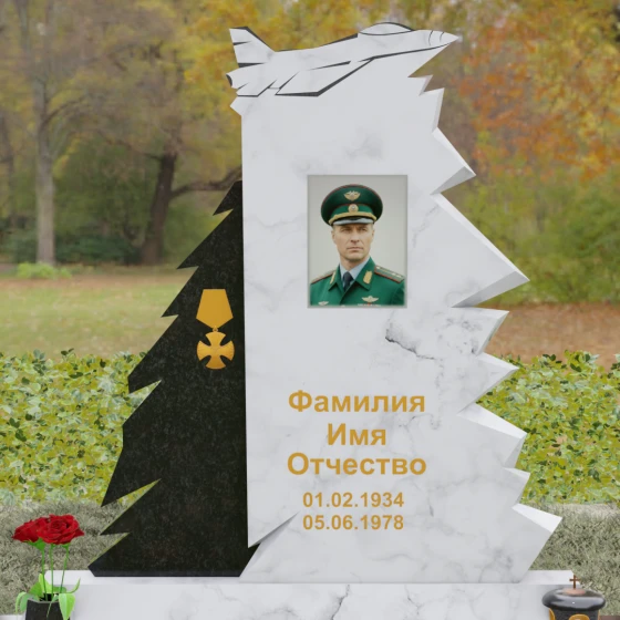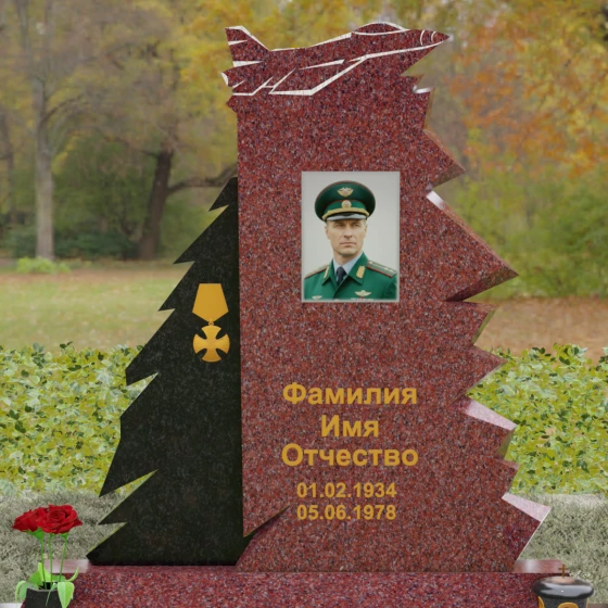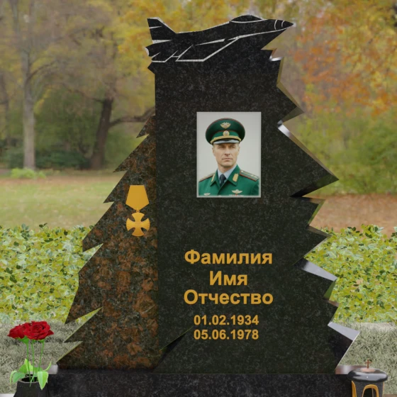 Надгробие из натурального камня (Артикул 202) — это монументальная композиция, созданная для того, чтобы увековечить память о человеке чести, чья жизнь была неразрывно связана с небом и служением отечеству. Архитектурное решение стелы поражает своей динамикой и символизмом: в верхней части монумента застыл в стремительном взлете силуэт современного истребителя, выполненный с ювелирной точностью. Левая грань памятника решена в виде резных, асимметричных выступов, напоминающих ветви северной ели или ломаные линии скалистого утеса. Такая геометрия придает мемориалу мужественный, волевой характер, подчеркивая стойкость и твердость духа ушедшего. Игра ломаных линий и острых углов создает ощущение мощи, которое невозможно передать в классических прямоугольных формах.