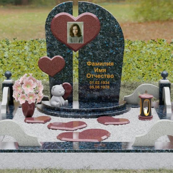 Визуальная концепция модели строится на гармоничном сочетании двух асимметричных вертикальных стел, выполненных из темного камня с безупречной зеркальной полировкой. Центральным элементом композиции является объемное сердце из контрастного красного гранита, которое словно объединяет две половины памятника. В его центре располагается портрет, обрамленный тонкой фаской, что создает эффект драгоценного медальона. Дополнительный акцент вносит второе, меньшее по размеру сердце, закрепленное на левой части стелы, что добавляет динамики и многослойности художественному образу.