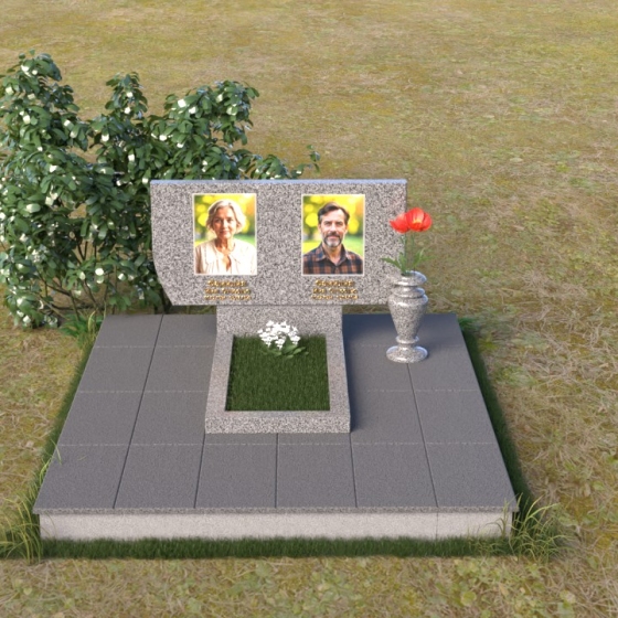 Памятник ПГ015 представляет собой композицию, состоящую из массивной стелы, горизонтальной плиты и тумбы. Стела, выполненная в форме прямоугольника со слегка скошенными верхними углами, создает ощущение надежности и основательности. Зеркальная полировка камня придает ей благородный блеск, отражая свет и создавая игру теней, подчеркивающую глубину и объем. На стеле располагаются два портрета, выполненные с высокой точностью, а также памятные надписи, выполненные золотым шрифтом. Справа от портретов, словно символ вечной памяти, размещена небольшая ваза, в которой можно разместить живые или искусственные цветы.
