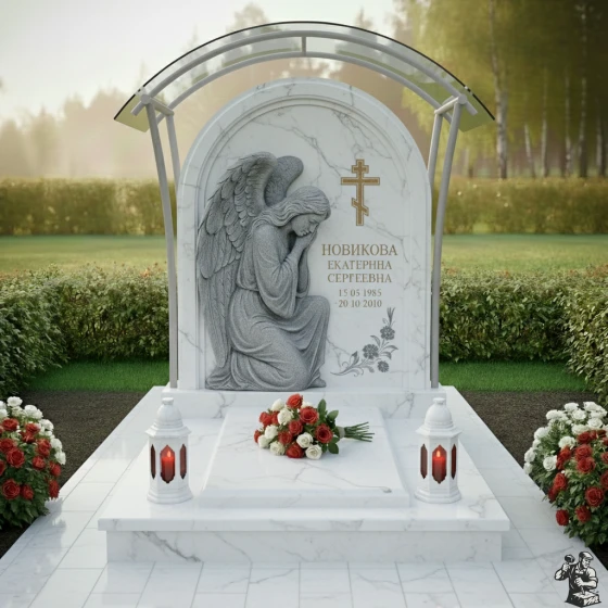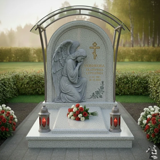 Плавные изгибы стелы, напоминающие мягкую волну, символизируют жизненный путь, его изменчивость и в то же время неизбежное движение к покою. Форма арки, обрамляющая фигуру ангела, ассоциируется с небесным сводом, защитой и переходом в иной мир. Скорбящий ангел – это мощный символ утешения, защиты и веры в бессмертие души. Он олицетворяет присутствие высших сил, оберегающих усопшего и дарующих покой его близким. Цветочная гравировка в нижней части стелы служит напоминанием о быстротечности жизни и ее красоте, а крест – о христианской вере и надежде на вечную жизнь. Вся композиция наполнена глубоким смыслом, призывая к осмыслению и принятию неизбежности, но при этом даруя утешение и надежду.