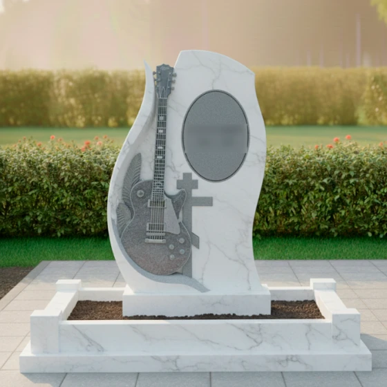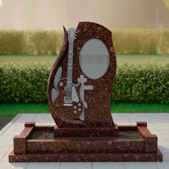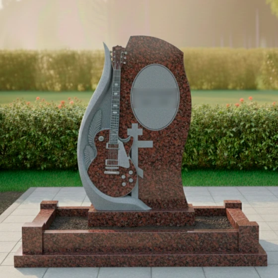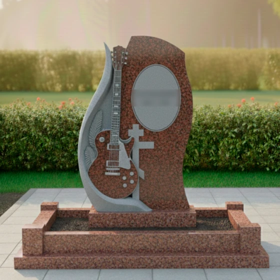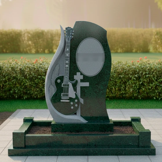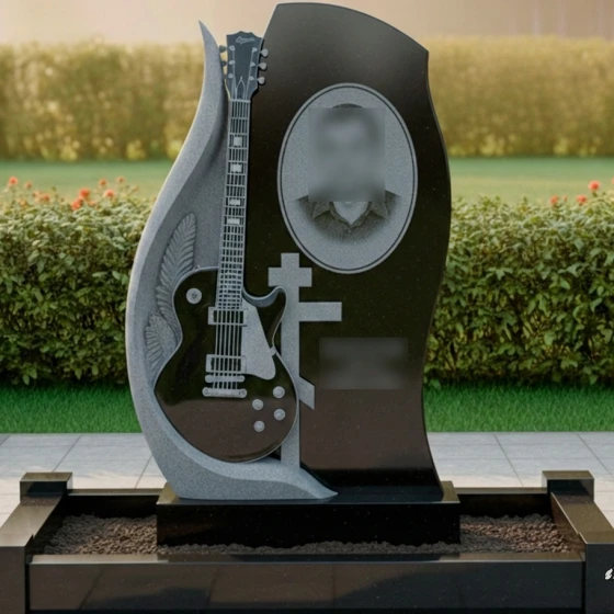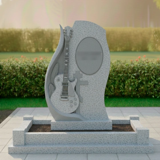 Центральным элементом композиции является искусно вырезанная из камня электрогитара, расположенная на отдельной, более светлой стеле, которая словно обнимает основную. Эта гитара, выполненная с поразительной детализацией, от струн до колков и регуляторов, становится мощным символом музыкального таланта и любви к искусству. Резьба по камню выполнена с таким мастерством, что кажется, будто инструмент готов зазвучать. Слева от гитары, изгибаясь вверх, просматривается резьба, напоминающая крыло или стилизованный лавровый венок, что придает композиции дополнительный смысл — полет души, славу и признание. Рядом с гитарой расположен лаконичный православный крест, символизирующий веру и покой. Справа на основной стеле, в овальной рамке, предусмотрено место для портрета, который будет гармонично вписан в общую концепцию, а ниже — пространство для эпитафии.