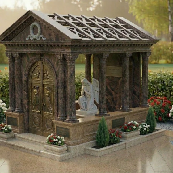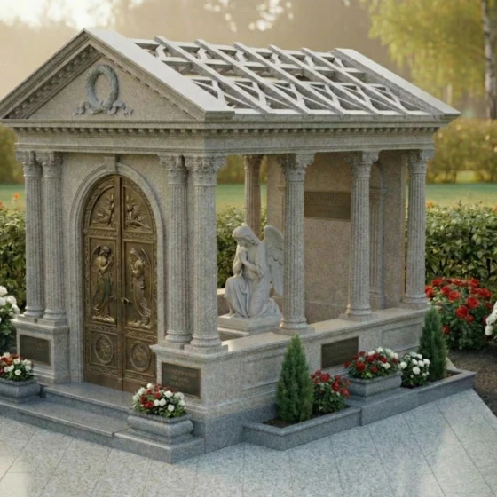 Представляем вашему вниманию величественную стелу – монументальный мемориальный комплекс ПН 043, который является не просто памятником, а настоящим произведением искусства, воплощающим глубокое уважение и вечную память. Этот архитектурный шедевр выполнен в форме изящного мавзолея с открытой крышей, создающей ощущение возвышенности и стремления к небесам. Строгие, но при этом гармоничные линии классической архитектуры, с колоннами и фронтоном, придают комплексу неподвластную времени элегантность. Центральное место занимает величественная стела, выполненная из темного, глубоко полированного камня, который словно зеркало отражает свет, символизируя чистоту и ясность воспоминаний. На этой стеле, расположенной внутри мавзолея, предусмотрено идеальное пространство для гравировки портрета и памятных слов, которые будут увековечены с особой торжественностью. Рядом с ней, в скорбной позе, застыла фигура ангела, вырезанная из светлого мрамора. Ее нежные, плавные линии и объемные складки одеяния создают трогательный контраст с полированной поверхностью стелы, добавляя композиции глубины и эмоциональности. Каждая деталь резьбы, будь то изысканный венок на фронтоне или тонкие узоры на дверях, выполнены с поразительной точностью и мастерством, подчеркивая уникальность и достоинство этого монумента.