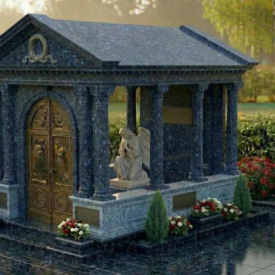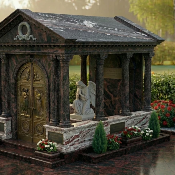 Основой этого уникального мемориального комплекса является прочный и долговечный гранит, известный своей исключительной плотностью, устойчивостью к любым погодным условиям и способностью сохранять свой первозданный вид на протяжении веков. Зеркальная полировка поверхности камня не только придает ему благородный блеск, но и защищает от воздействия влаги и мороза, делая уход за памятником минимальным. Монумент установлен на массивный гранитный цоколь, который опоясывает весь периметр, придавая конструкции дополнительную устойчивость и законченный вид. Высокий бордюр, выполненный из того же камня, что и основание, создает четкие границы и подчеркивает монументальность комплекса. Внутреннее пространство комплекса выложено аккуратными надгробными плитами, что не только создает эстетически завершенный вид, но и значительно упрощает уход за местом упокоения. Эти плиты, выполненные в едином стиле с основным материалом, гармонично вписываются в общую композицию. По углам комплекса расположены декоративные элементы – невысокие каменные столбики, которые подчеркивают архитектурный стиль и придают мавзолею еще большую торжественность. Вазы, расположенные вдоль цоколя, идеально подходят для размещения живых цветов, добавляя нотку тепла и жизни в эту величественную композицию.
