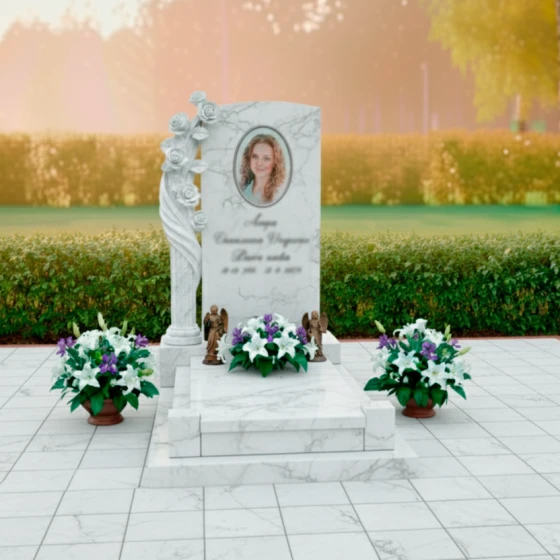 • Мрамор Тассо: Изысканный белый мрамор с утонченными прожилками, придающий памятнику нежность и классическую элегантность.