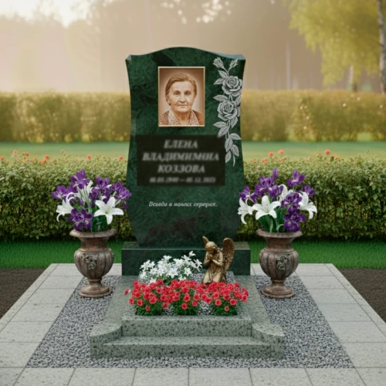 Оформление: Форма стелы Артикул: ПН 139 идеально подходит для различных видов гравировки. Для портрета рекомендуется использовать лазерную гравировку, которая позволяет достичь максимальной детализации и сохранить живое выражение лица. Благодаря полированной поверхности черного гранита, портрет будет выглядеть контрастно и выразительно, а игра света на гранях камня придаст ему дополнительный объем. ФИО и даты жизни лучше всего выгравировать глубокой гравировкой с последующим покрытием сусальным золотом или серебряной краской, что обеспечит их долговечность и читаемость. Изогнутая форма стелы также позволяет разместить на ней дополнительные элементы декора, такие как ветви растений, свечи или символические узоры, которые дополнят общую композицию и сделают ее еще более индивидуальной.