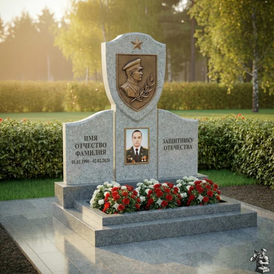 Оформление: Для этой формы стелы, с ее четкими линиями и выразительными гранями, идеально подходит гравировка портрета, выполненная в классическом стиле. Рекомендуется использовать технику глубокой гравировки, которая обеспечит долговечность изображения и его устойчивость к внешним воздействиям. ФИО и даты жизни лучше всего располагать центрированно, используя строгий, но элегантный шрифт, который будет гармонировать с общей торжественностью монумента. Возможно добавление символических элементов, таких как ветви дуба или лавра, которые могут быть выгравированы по краям стелы, подчеркивая доблесть и мужество.