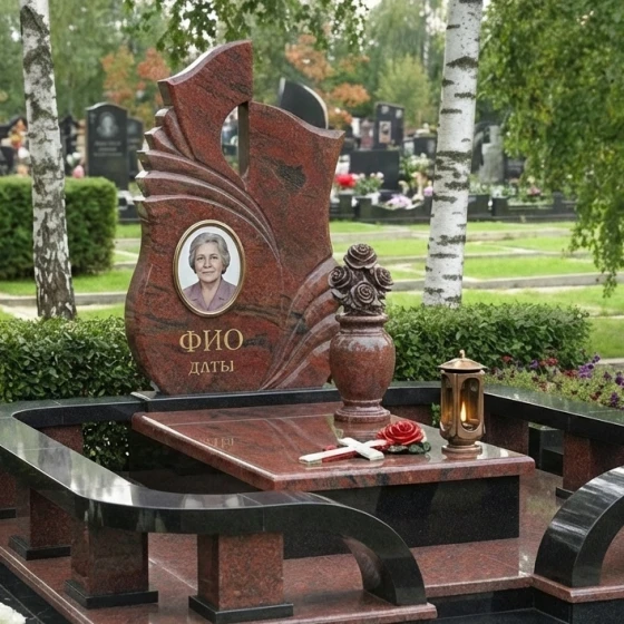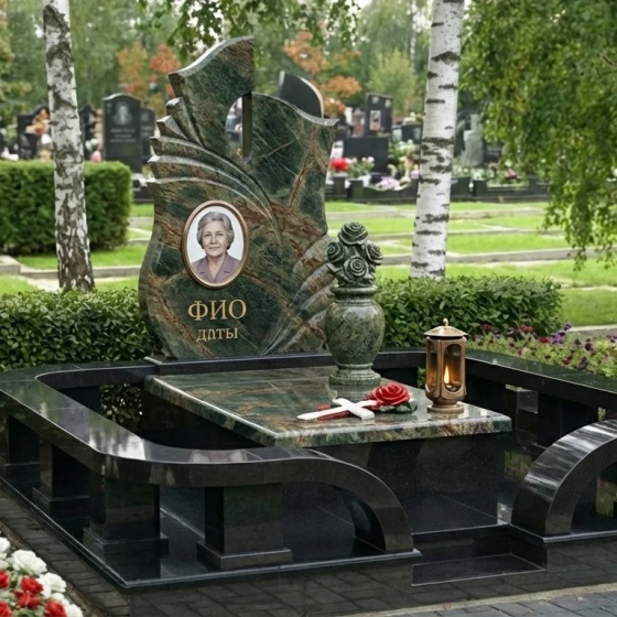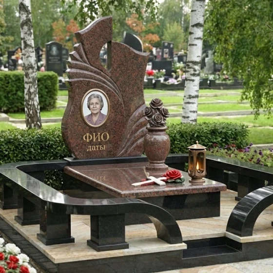 Оформление: Учитывая динамичную форму стелы и наличие резных элементов, мы рекомендуем для портрета использовать классическую овальную или прямоугольную форму, что создаст гармоничный контраст с плавными линиями камня. Гравировка ФИО и дат будет наиболее выигрышно смотреться в классических, хорошо читаемых шрифтах, выполненных с золочением или серебрением, чтобы подчеркнуть торжественность момента и обеспечить долговечность надписи. Мастера готовы предложить индивидуальные эскизы, которые идеально впишутся в выбранный вами камень и форму.
