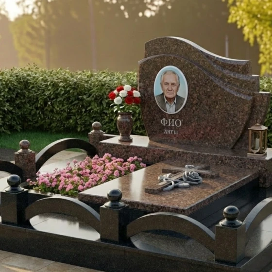 Оформление: Для этой формы стелы, напоминающей свиток, идеально подходит гравировка портрета в овальной или прямоугольной рамке, которая будет гармонично смотреться на фоне плавных изгибов. Рекомендуется использовать классические шрифты для ФИО и дат, чтобы сохранить строгий и достойный вид. Возможно добавление небольших символических элементов, таких как ветви, цветы или религиозные символы, которые будут деликатно вписаны в общую композицию, не нарушая ее гармонии.