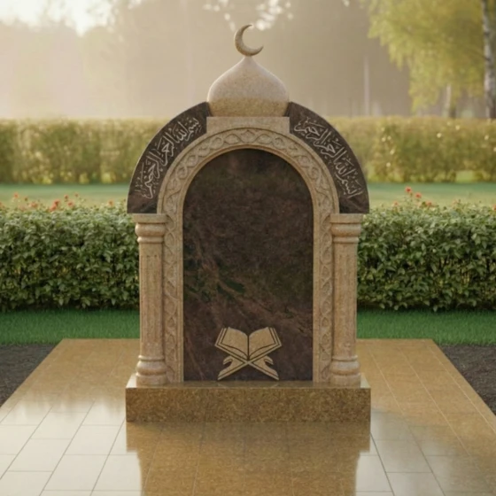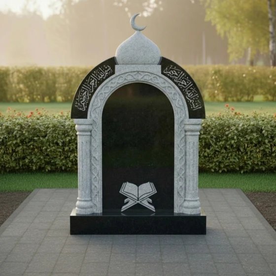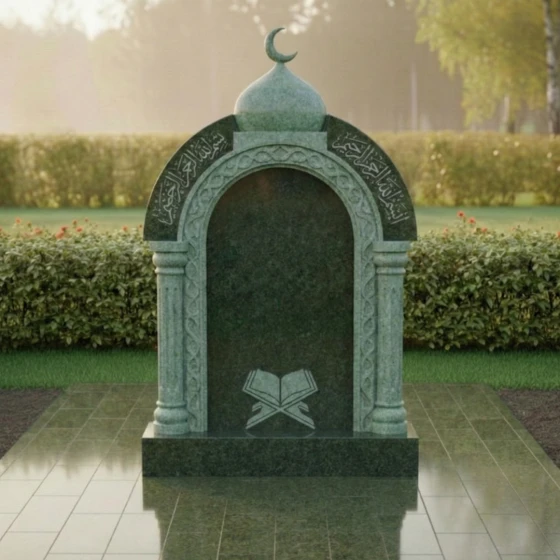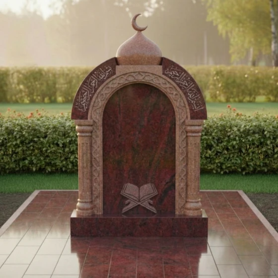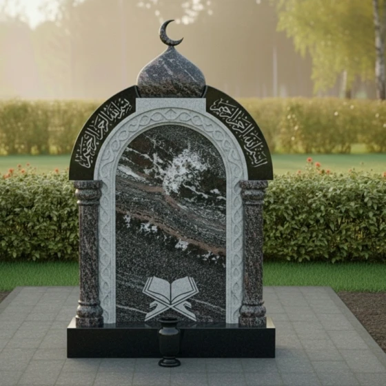 Представляем вашему вниманию величественное надгробие из натурального камня, модель ПН 507, которое является воплощением глубокого уважения и вечной памяти. Этот мемориальный комплекс спроектирован с учетом строгих архитектурных принципов, где каждая линия и форма призваны выразить достоинство и умиротворение. Центральная стела выполнена в форме изящной арки, напоминающей вход в священное пространство, что придает ей особую символичность. Ее внутренняя часть представляет собой глубокий черный полированный портал, создающий эффект зеркальной глади, в которой отражается свет и скорбь. Внешний периметр арки украшен тонкой резьбой, имитирующей витиеватые узоры, характерные для восточной архитектуры, что придает монументу уникальный и узнаваемый облик. Над аркой возвышается куполообразный элемент, увенчанный полумесяцем, что недвусмысленно указывает на его религиозную принадлежность и придает всей композиции завершенность и духовную значимость. Полумесяц выполнен с деликатной точностью, его острые грани четко очерчены на фоне неба, символизируя светлую память.