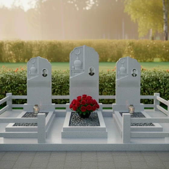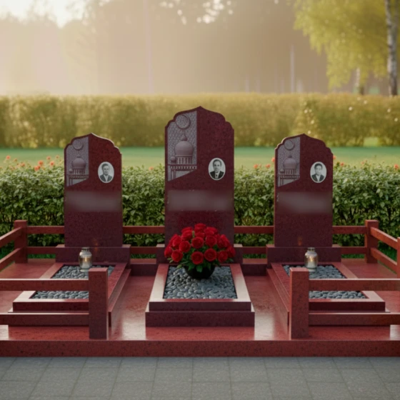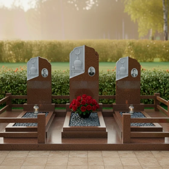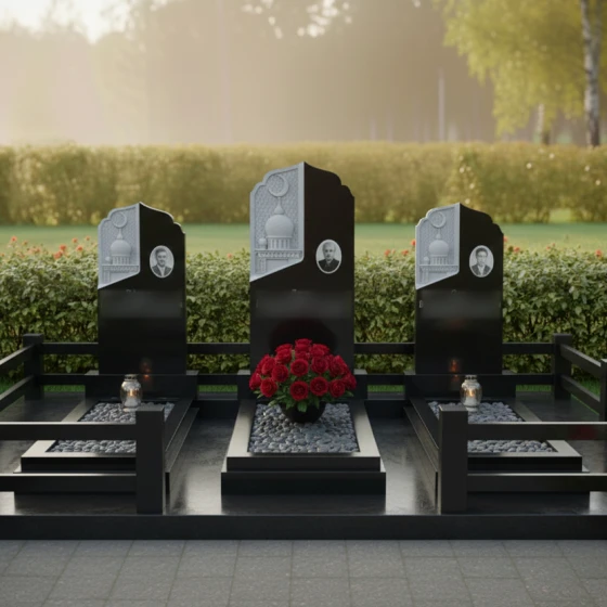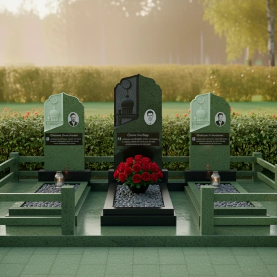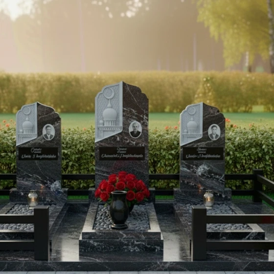 Кому подойдет: Данная трехсоставная мемориальная композиция станет идеальным выбором для оформления семейного захоронения на три персоны. Она ориентирована на людей, ценящих традиции мусульманской культуры, эстетику восточного зодчества и стремящихся создать на кладбище атмосферу защищенности, покоя и величия. Строгие формы в сочетании с изящной резьбой делают этот ансамбль универсальным решением для увековечивания памяти родителей, супругов или близких родственников, подчеркивая неразрывную связь поколений.