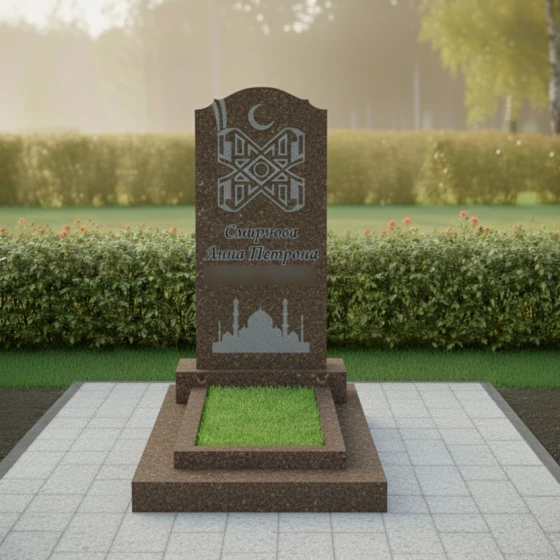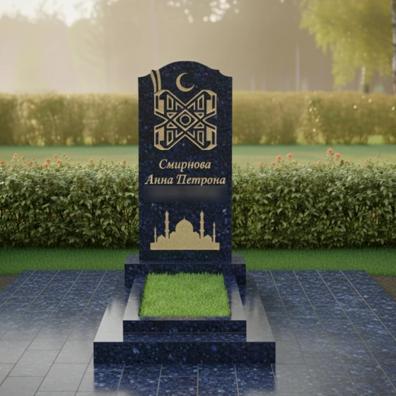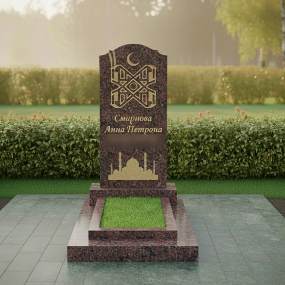 Особое внимание привлекает филигранная гравировка, расположенная в верхней части стелы. Символ полумесяца и сложный геометрический орнамент, выполненные с ювелирной точностью, подчеркивают конфессиональную принадлежность и глубокую связь с верой. В нижней части полотна расположено контурное изображение мечети с высокими минаретами — это не просто декор, а символ духовного пристанища и покоя. Сочетание глянцевой поверхности основного камня и матового, светлого напыления внутри резных элементов создает благородный контраст, делая изображение объемным и читаемым при любом освещении.