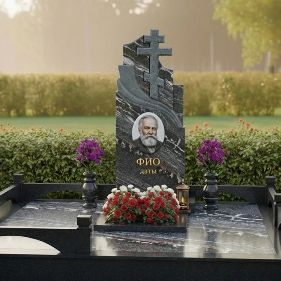 Центральным элементом композиции является массивная стела, выполненная в строгой, но в то же время выразительной форме. Её верхняя часть представляет собой величественное сочетание двух православных крестов, один из которых возвышается над другим, создавая ощущение духовной защиты и вознесения. Кресты отличаются лаконичностью и четкостью линий, без излишних деталей, что подчеркивает их сакральное значение. Справа от вертикального креста, плавно переходя в его основание, вырезан изящный горизонтальный элемент, напоминающий стилизованную драпировку или развевающееся знамя, которое придает монументу динамику и глубину. Левая грань стелы имеет строгую прямолинейную форму, подчеркивая монументальность, в то время как правая грань изящно изогнута, создавая плавную волну, которая смягчает общий облик и добавляет ему художественной выразительности. Все грани стелы тщательно отполированы до зеркального блеска, что позволяет камню играть на свету, отражая окружающий мир и создавая глубокие блики. Контраст полированной поверхности с матовыми, слегка шероховатыми срезами на резных элементах крестов и драпировки, создает удивительную игру фактур, подчеркивая мастерство обработки камня.